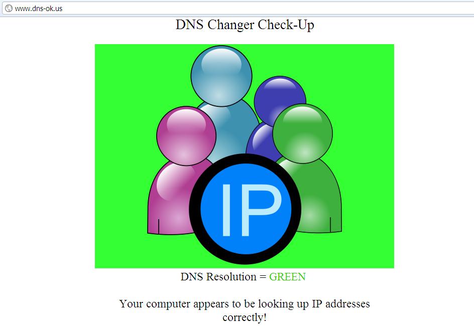 Hijau; Indikasi bahwa komputer aman dari DNSChanger |